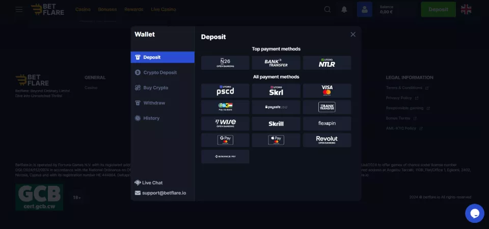 Játsszon a Betflare online kaszinóban valódi pénzért, szerezzen nyereményt, majd a KYC-azonosítást követően tud pénzt befizetni. Ehhez választhat fizetési módot és megadhatja a kívánt összeget.