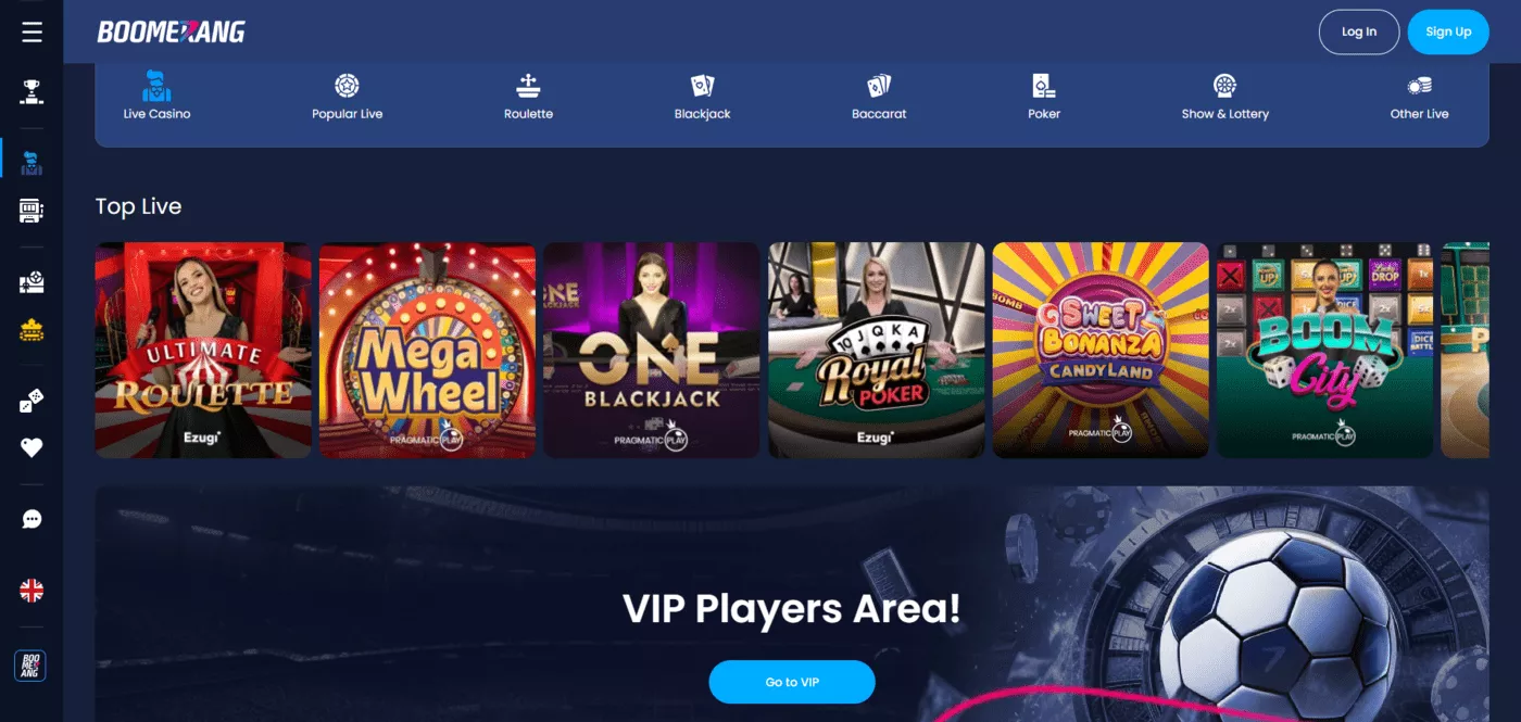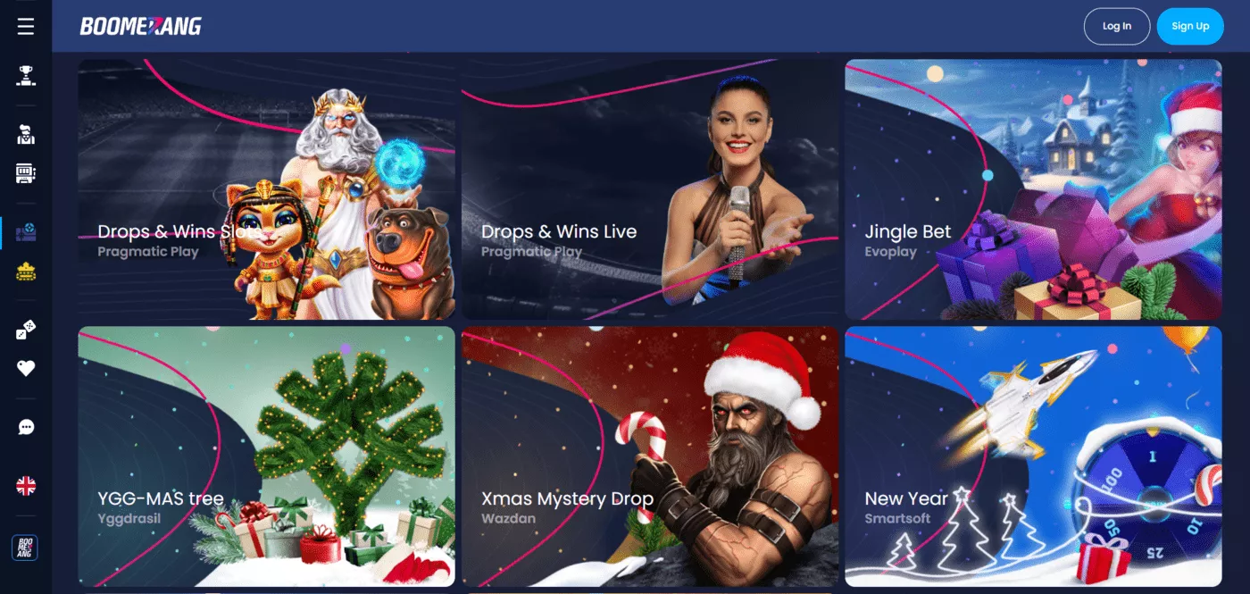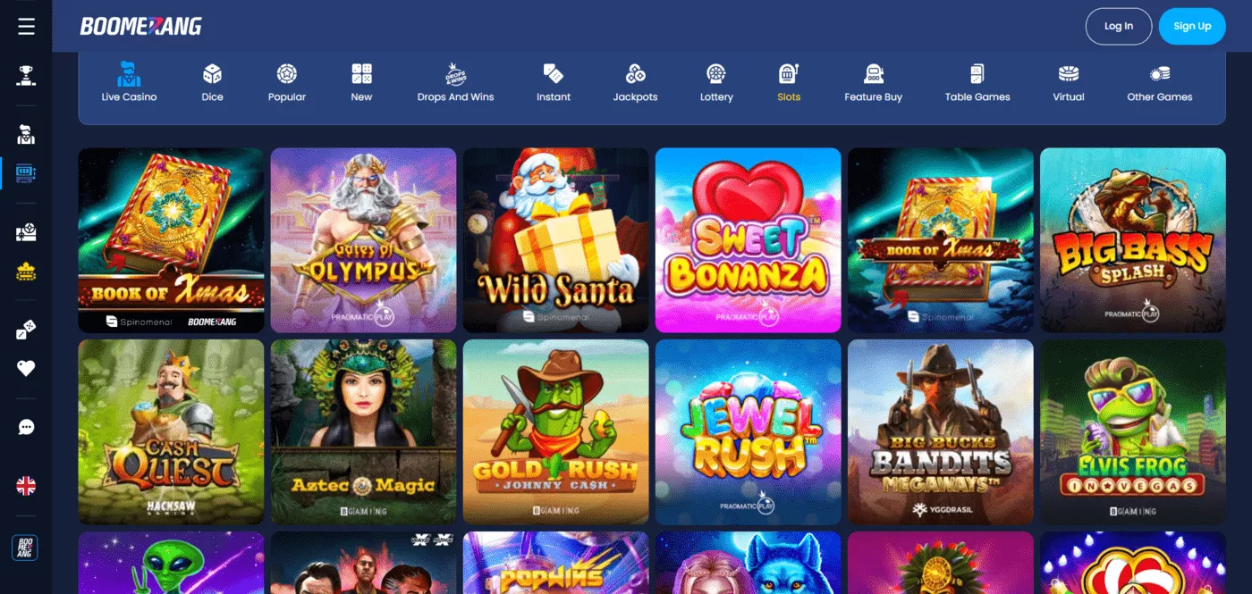 Boomerang bet kaszinó játékok hatalmas választékát nyújtja. Több mint ezer nyerőgép, valamint több mint 250 asztali játék szerepel a kínálatban. Az asztali játékokhoz tartozik például a rulett, blackjack, póker, baccarat.