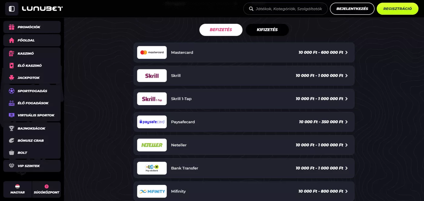 A LunuBet Casino online fizetési módok terén szintén nagy választékot biztosít. A bankkártyás és banki átutalásos fizetésen kívül vannak még itt e-tárcák és kriptovaluták is.