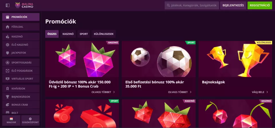 A Malina kaszinó bónusz részlegén minden VIP tagsággal rendelkező játékos megtalálhatja a számára legkedvezőbb ajánlatot.