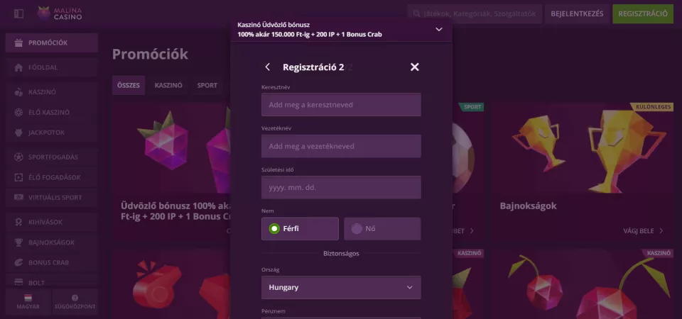 Válassza ki üdvözlő bónuszát, majd lépjen tovább – A felugró ablakban válassza ki, hogy Kaszinó (100% akár 150.000 Ft-ig + 200 IP + 1 Bonus Crab) vagy Sport (100% akár 35.000 Ft-ig) üdvözlő bónuszt szeretne igényelni, illetve ha van promóciós kódja, azt ugyanezen a fülön tudja megadni. A megfelelő mező kijelölése után kattintson a “Válassz” gombra és folytassa a regisztrációt a következő ablakban.