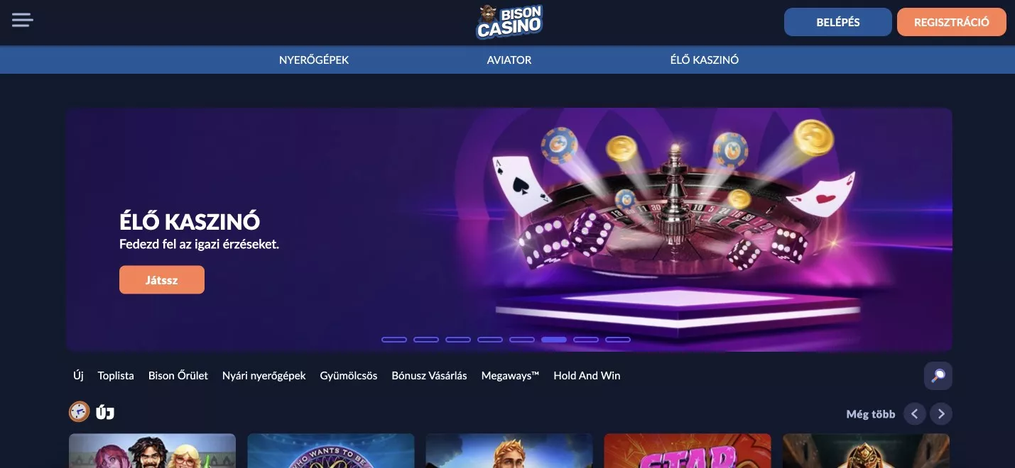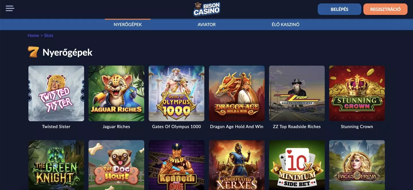 A Bison kaszinó változatos és gazdag játékkínálatot nyújt a magyar játékosok számára. A több mint 6000 játék között mindenki megtalálja azt, amelyik legjobban kielégíti az igényeit. Az online kaszinó platformja olyan játéktípusokat kínál, mint a nyerőgépek, ahol a hagyományostól a legmodernebb, több tárcsás slotok vannak. Az asztali játék kategóriában megtalálhatók a legnépszerűbb blackjack, rulett és póker játékok. De a crash és a Bison élő kaszinó játékok is nagyot mennek a felhasználók körében.