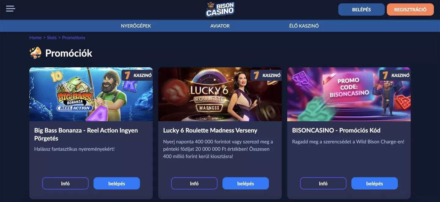 A Bison kaszinó weboldalán számos rendkívüli bónuszt és promóciós ajánlatot találhatunk. Ami pedig a legkiemelkedőbb, hogy a minimális befizetési összeg a legtöbb esetében csak 2 000 Ft, ami a többi kaszinóhoz képest nagyon kevésnek számít.