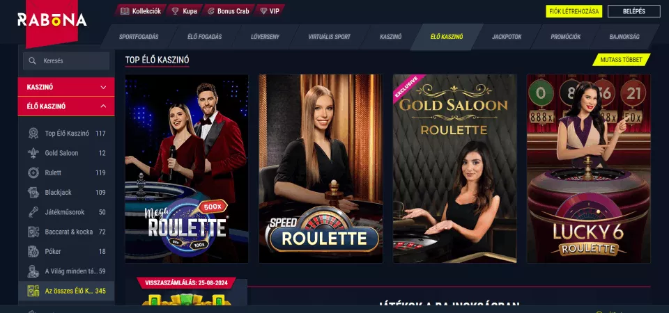 Ha az élő játékok érdekelnek jó, ha tudod, hogy a Rabona kaszinó mobil app felülvizsgálat során kiderült, hogy ezek is elérhetőek még mobilról is. A legnépszerűbbek: