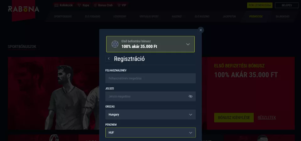 Keresd fel a Rabona weboldalát – Kattints a jobb felső sarokban található „Regisztráció” gombra.