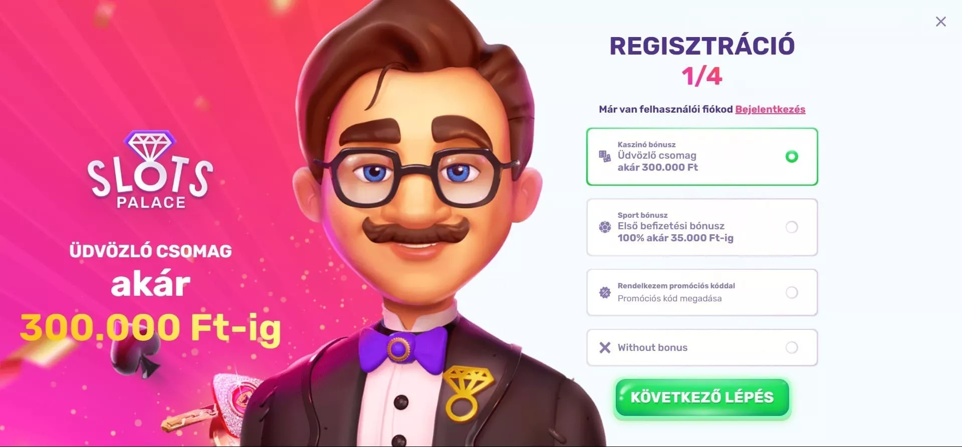 A regisztrációhoz először menj a Slots Palace casino online oldalára, majd kattints a jobb felső sarokban található “Regisztráció” gombra. Ez után fel fog ugrani egy ablak, ahol már jelzi is a rendszer, hogy a regisztráció négy lépésből fog állni. Első lépésként válaszd ki, hogy milyen bónuszt szeretnél majd felhasználni az első játékod során. Ez lehet a kaszinó üdvözlő bónusz, sportfogadásra felhasználható első befizetési bónusz, promóciós kód, de választhatod azt is, hogy nem használsz fel üdvözlő bónuszt. Ezután írd be az e-mail címed, felhasználóneved, üsd be a mobil telefonszámod, adj meg egy jelszót, majd fogadd el az ÁSZF-et és igazold, hogy betöltötted a 18. Életéved. Következő lépésként add meg a személyes adataid, neved és címed, ezután kattints a “Regisztráció” ikonra. Fontos megjegyezni, hogy a regisztráció hitelesítése során a SlotsPalace személyi igazolvány kép elküldésére kérhet.