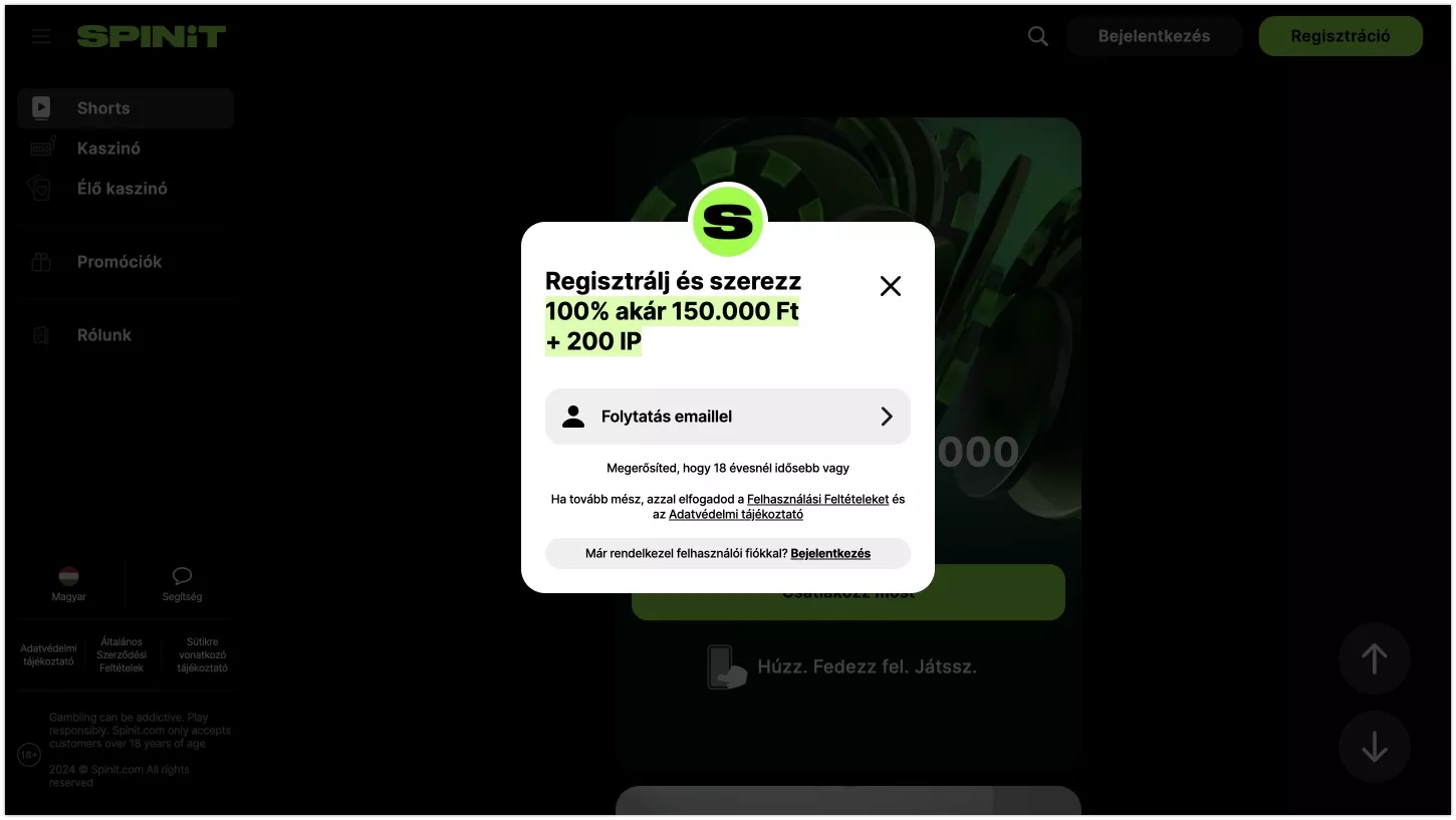 A hivatalos oldal megnyitása után kattints a fehér színű “belépés” feliratú gombra. Ha ez nem elérhető, akkor még nincsen saját játékos fiókja a kaszinónál. Hogyan kell regisztrálni a Spinit online kaszinóban? A válasz egyszerű: csak kattints a regisztráció gombra és töltsd ki az űrlapot. Ha ez megtörtént, akkor elérhetővé válik a bejelentkezés is.