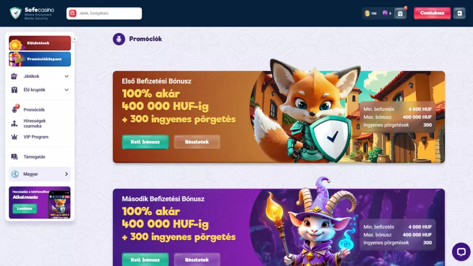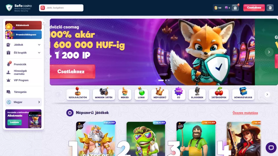 A SafeCasino egy modern, biztonság központú online kaszinó, ahol a szórakozás és a megbízhatóság szorosan összefonódik. Curacao engedéllyel működik, hátterében a tapasztalt Techsolutions N.V. áll. A platformot magyar nyelven is használhatják a játékosok, akik több mint 120 szolgáltató címei közül válogathatnak. A kínálatban megtalálhatsz minden típusú játékot, a klasszikus nyerőgépektől az élő osztós asztalokig, mindezt SSL titkosítással védett, átlátható rendszerben.