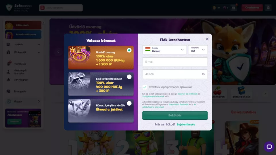 A kaland a regisztrációval indul: a SafeCasino már az első belépésedkor gondoskodik róla, hogy ne üres kézzel vágj bele a kalandba. Az üdvözlő csomag azonnal aktiválható, így az első pörgetések nemcsak izgalmat, hanem kézzelfogható plusz értéket is hoznak.